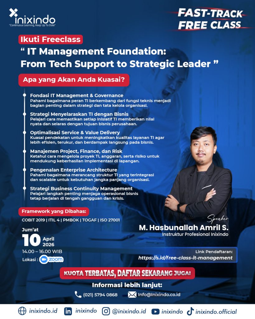 Dengan mengikuti webinar ini, kamu tidak hanya memahami konsep, tetapi juga mendapatkan perspektif bagaimana IT dikelola secara profesional di organisasi modern. Ini adalah langkah awal yang tepat untuk membangun karier sebagai IT Leader yang mampu mengelola layanan, risiko, dan nilai bisnis secara efektif.